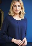 100% Polyester with mechanical stretch. Long sleeve ladies' blouse, round neck, front pleat detail, bust darts, single gold button cuff, rear gold zip detail, easy care - machine washable at 30 degrees